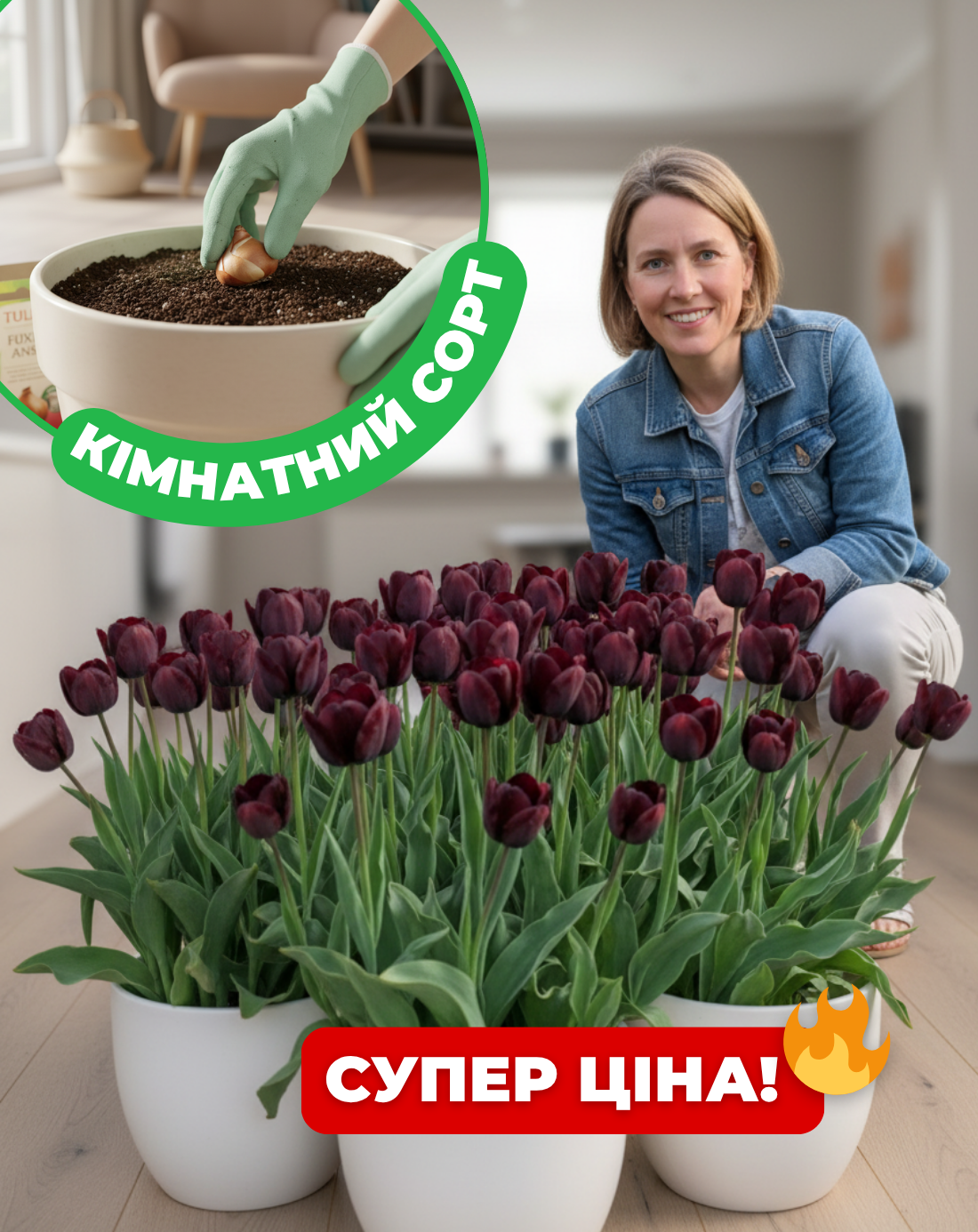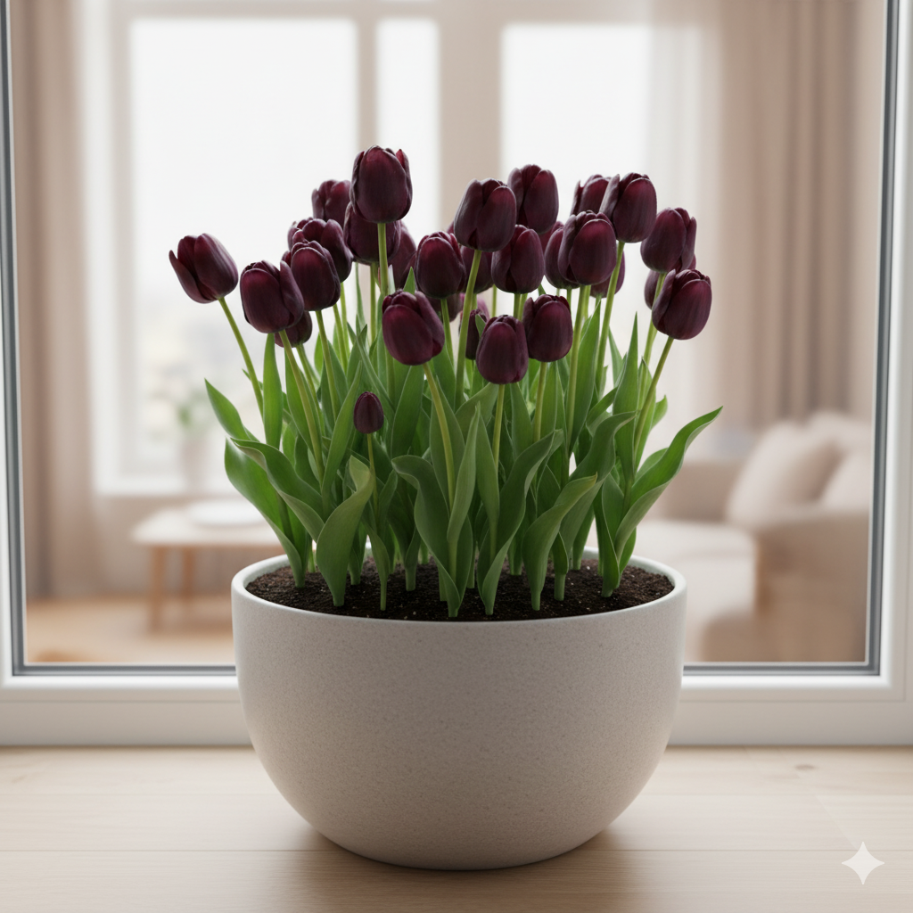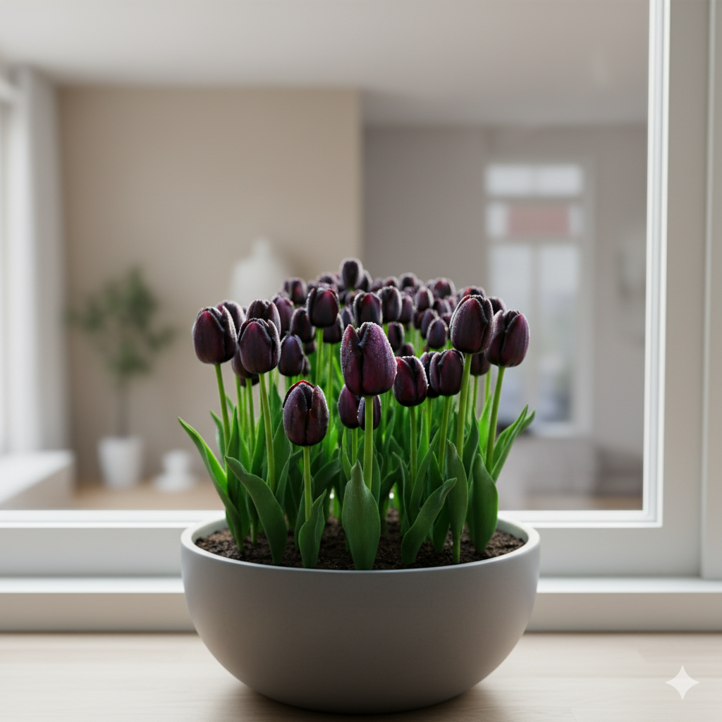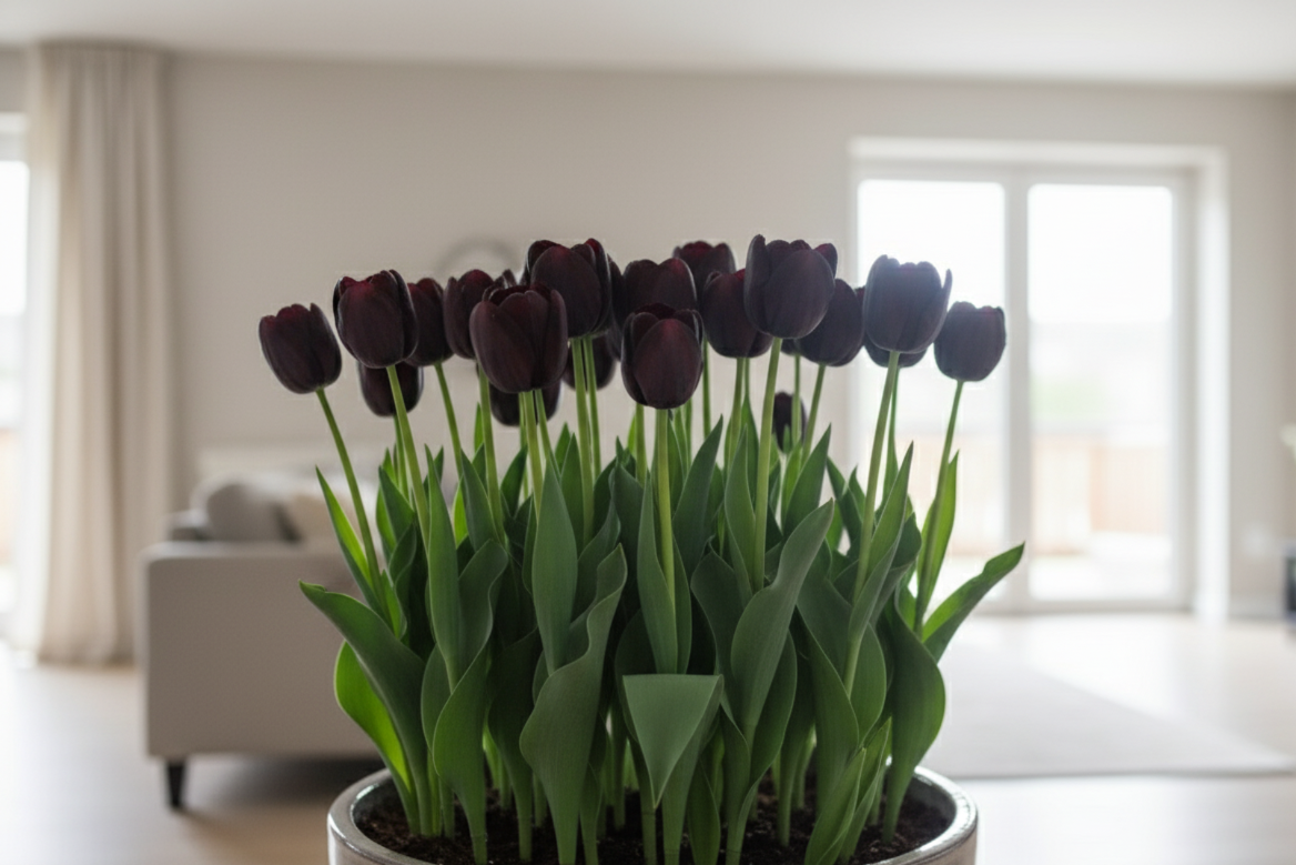 Ці тюльпани можуть цвісти кількома хвилями, наповнюючи інтер’єр глибиною кольору та шляхетною естетикою.