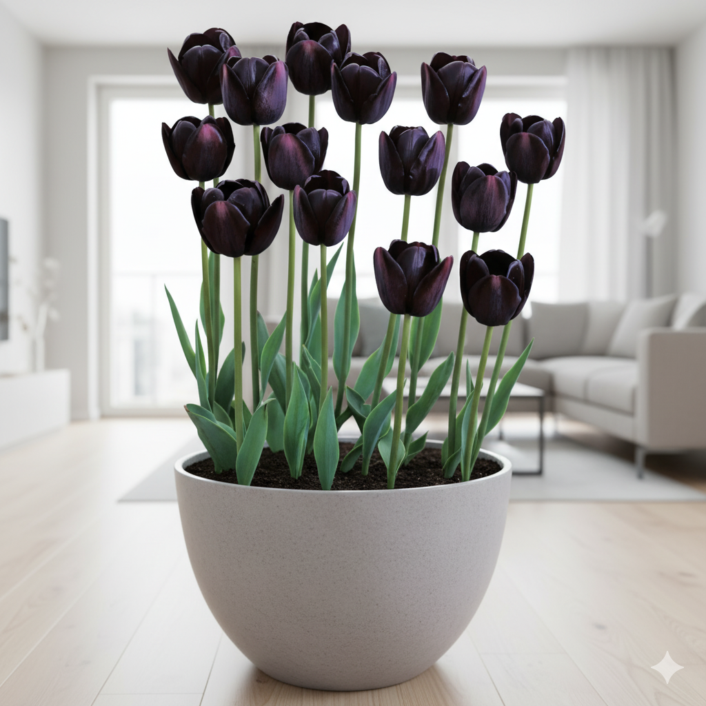 Глибокий, майже чорний відтінок пелюсток додає кімнаті нотку таємничості, розкоші й витонченості — саме тому Queen of Night обирають ті, хто хоче створити стильний і незабутній акцент у своєму просторі.