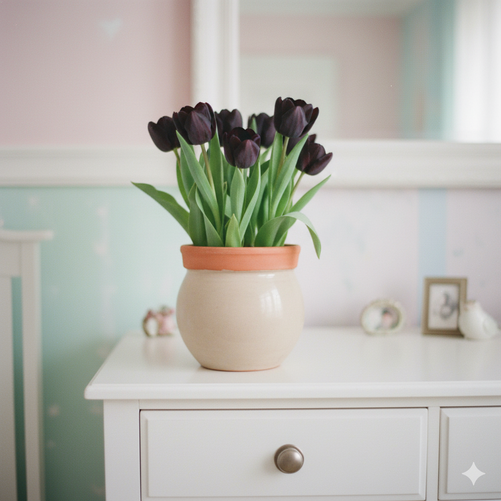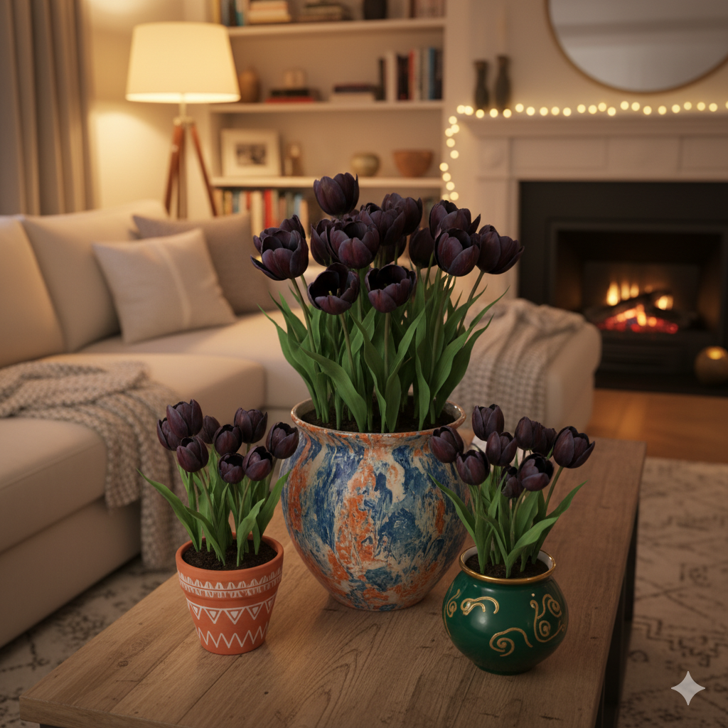Тюльпани Queen of Night чудово підходять для вирощування в горщику, адже цибулини швидко вкорінюються та активно розвиваються в домашніх умовах.
