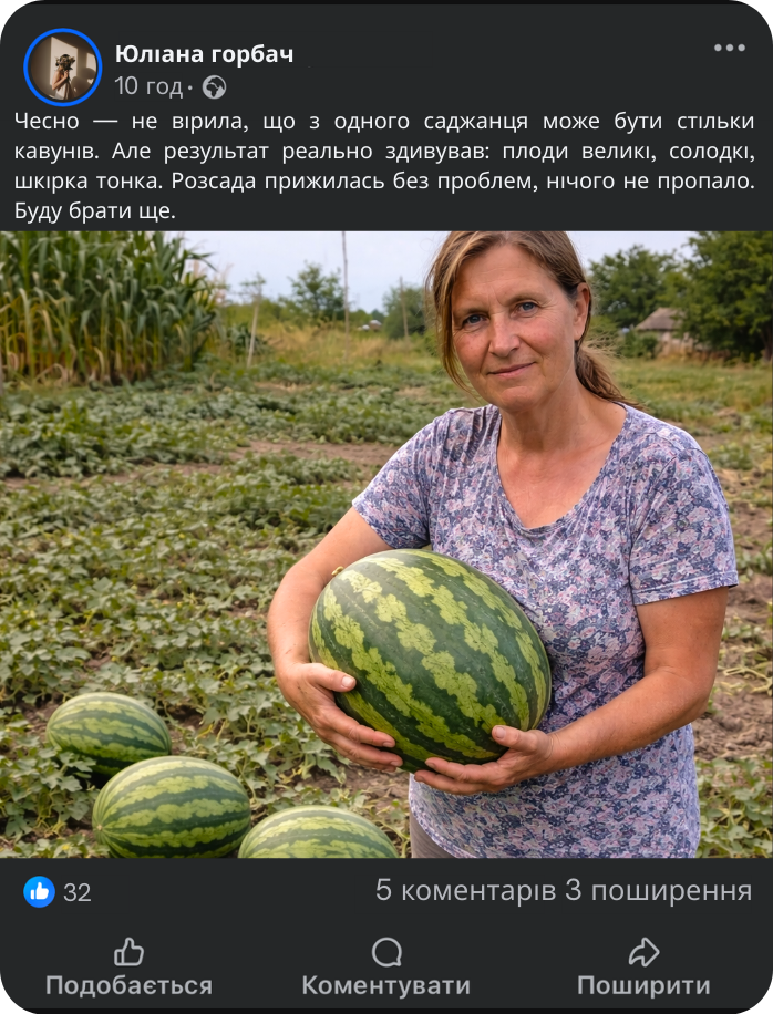 Кавуни виростають до 25 кг — це той випадок, коли результат видно одразу, без дрібноти й розчарувань.